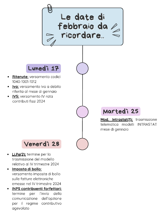 Di seguito si trasmette un promemoria delle principali scadenze fiscali e previdenziali ordinarie previste per il mese di febbraio.